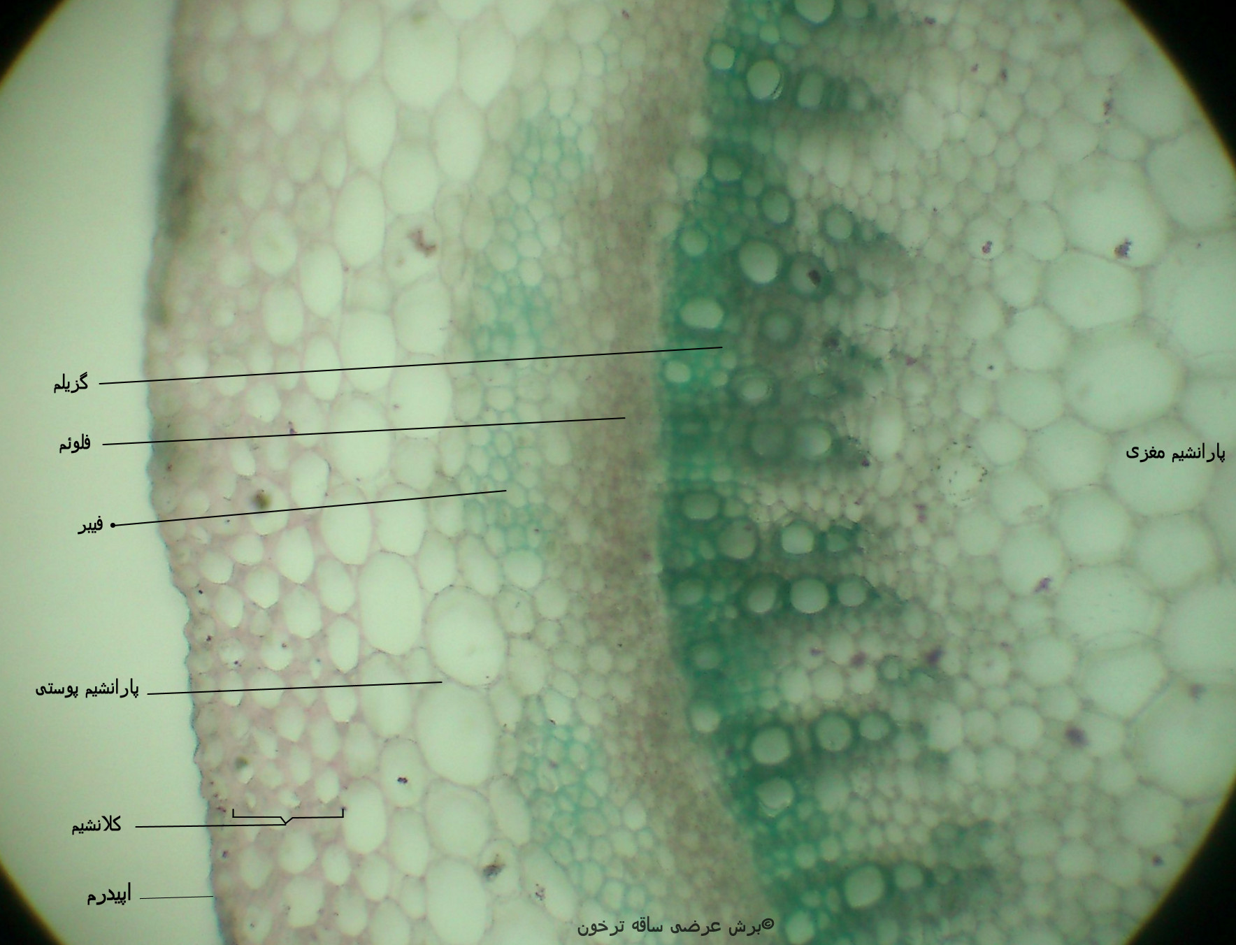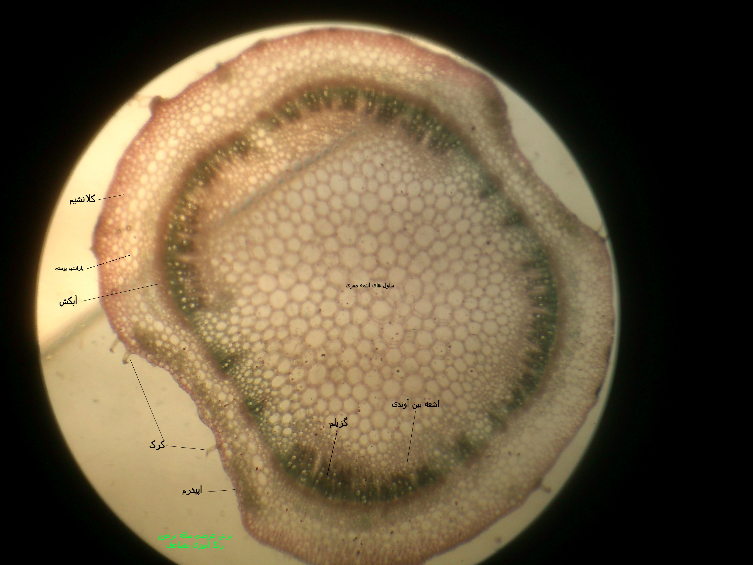 2. در تصاویر زیر برش های عرضی ساقه ترخون را که رنگ آمیزی مضاعف شده اند مشاهده میکنید.