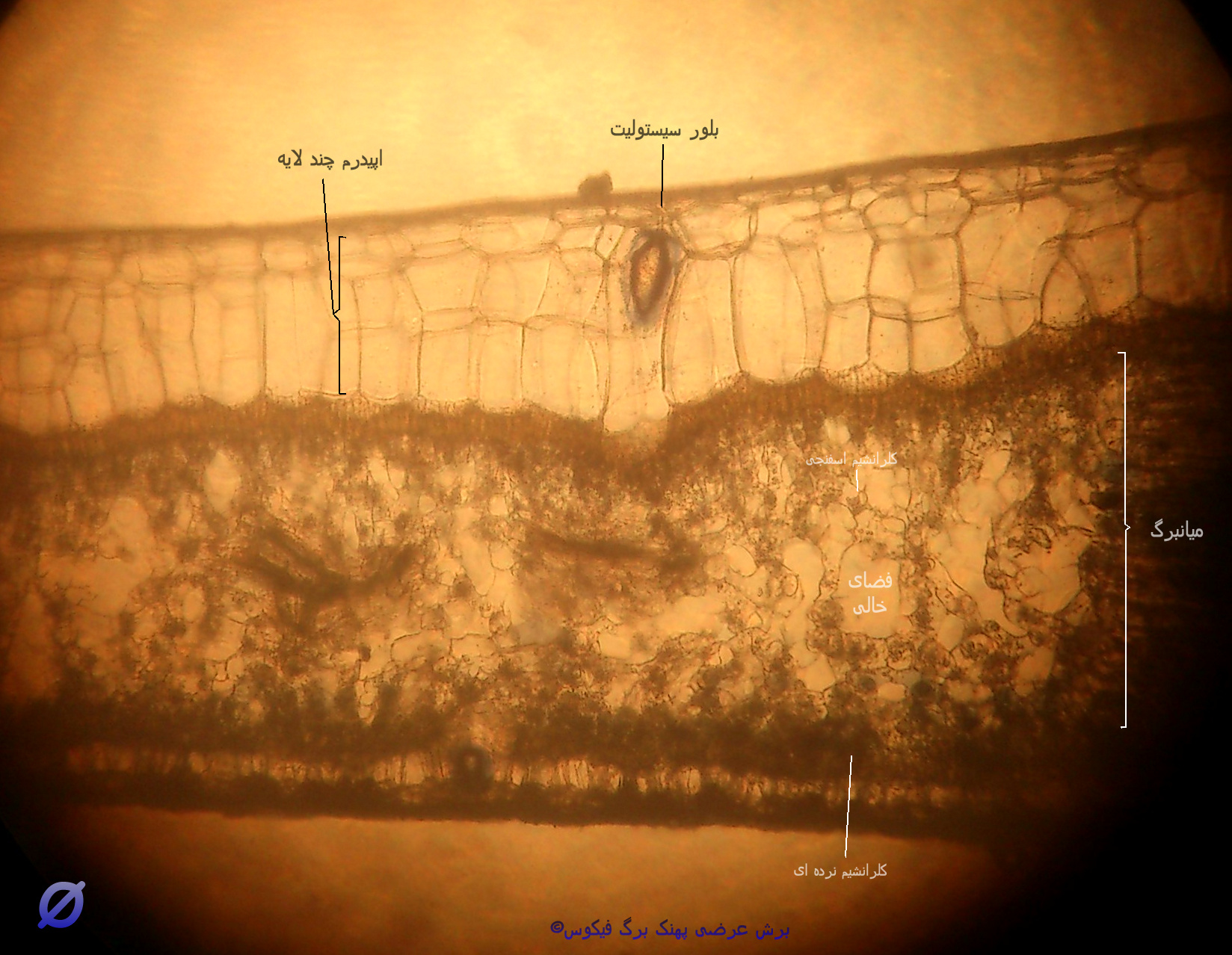در تصویر پایین بلور سیستولیت (از جنس کربنات کلسیم) در برگ فیکوس به زیبایی قابل مشاهده است
