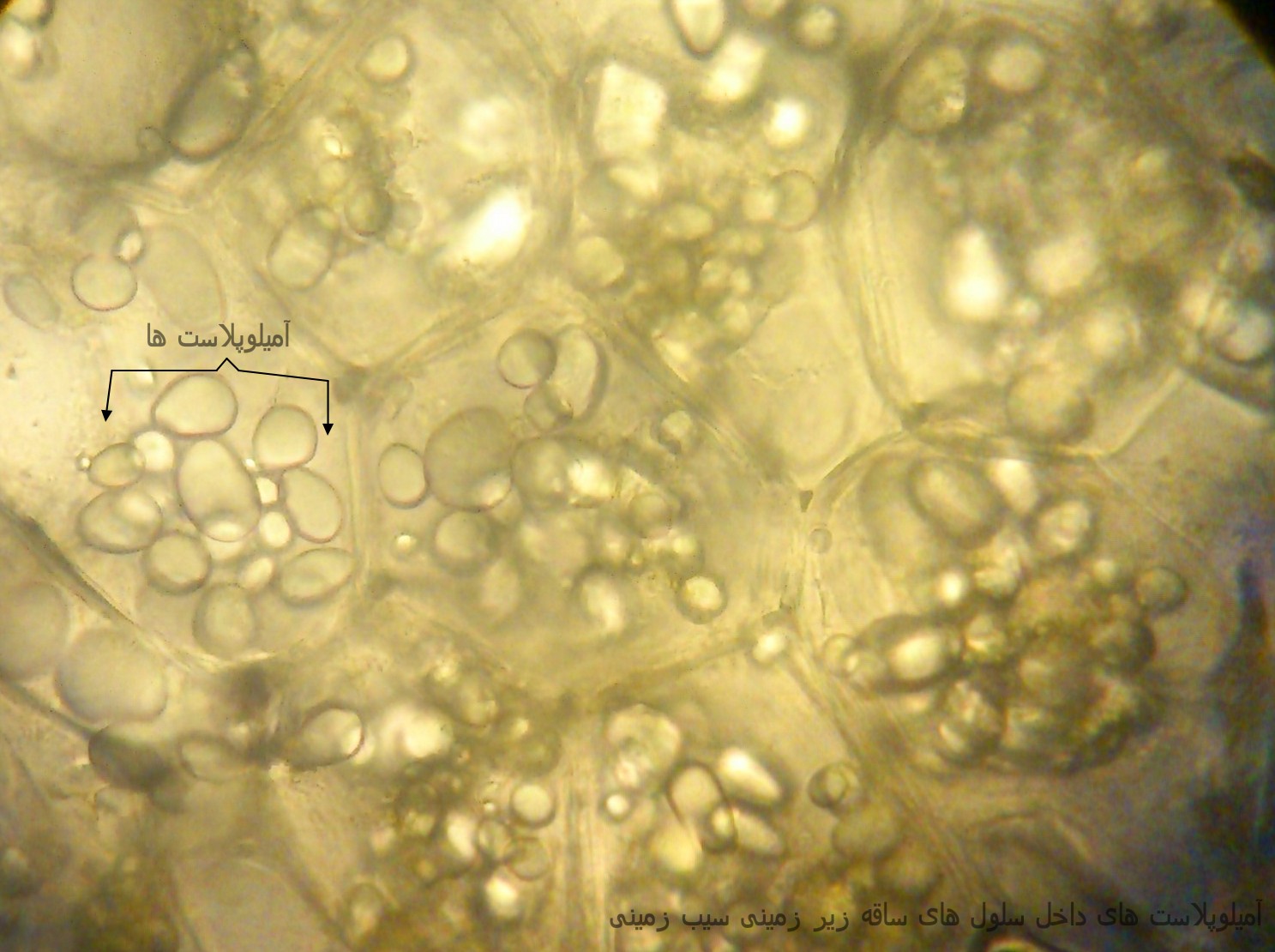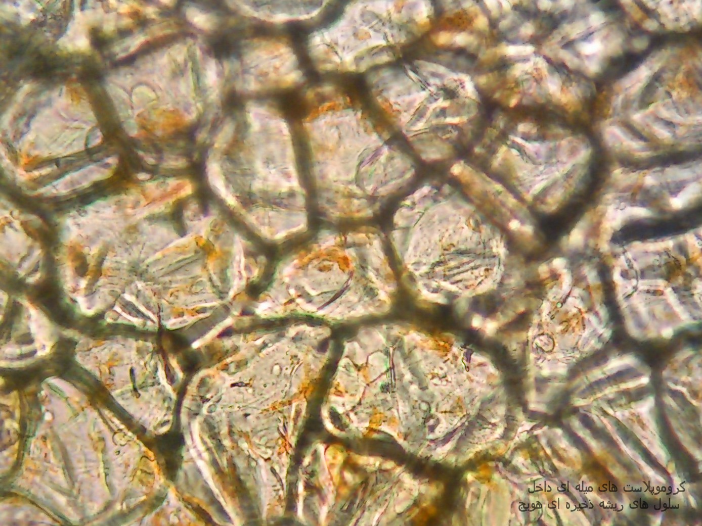 4. و در زیر تصاویر مربوط به برش عرضی از ریشه غده ای هویج و ساقه ی زیر زمینی سیب زمینی را مشاهده می کنید که کرومولاست های نارنجی رنگ آن و آمیلوپلاست های درشت سیب زمینی قابل مشاهده اند( این تصاویر بدون رنگ آمیزی اند)