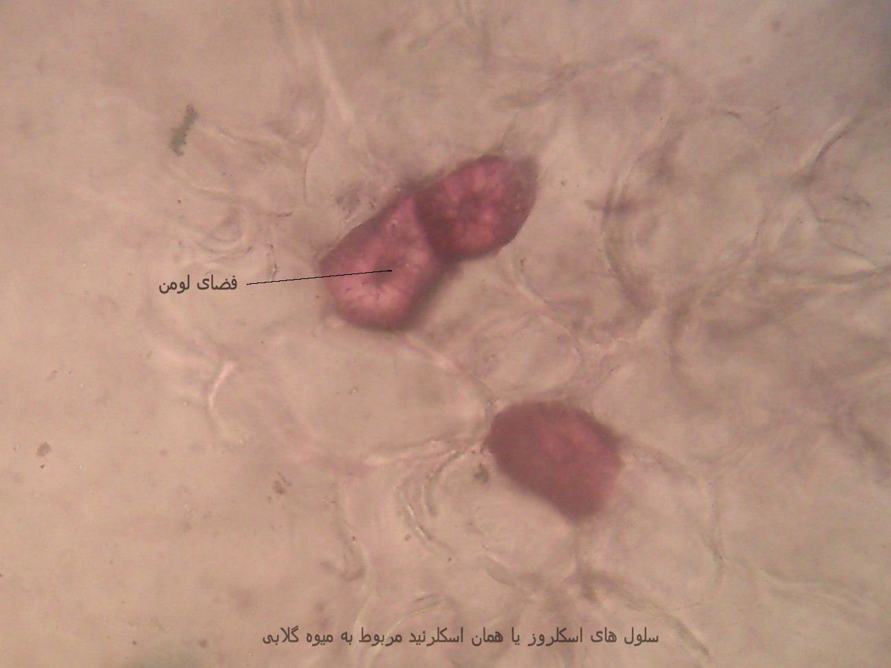 3. در تصویر زیر یک سلول اسکلرانشیم از نوع اسکلروز یا همان اسکلرئید که مربوط به میوه گلابی است قابل مشاهده می باشد که با فوشین بازی رنگ آمیزی شده است.